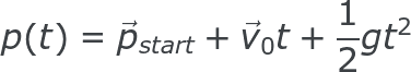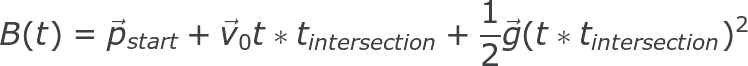 As was established in the previous section, with the use of quadratic Bézier curves one can get physically plausible results. Still, in some common cases it may be desirable to compute a true ballistic trajectory. Using the standard equations of motion and assuming an initial velocity (v0), no air drag or friction, and constant acceleration, we can come to the following position function:
