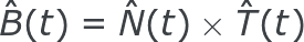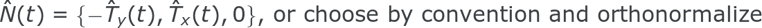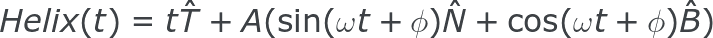Before we can apply our fuzzy displacements to the spline model, we need to obtain a tangent, normal, and binormal vector for the trajectory. Those who are interested in doing something more advanced can look into obtaining a Frenet frame. For our purposes, we are going to use the same techniques and conventions described in the Modelling Swirls subsection above, which give us: