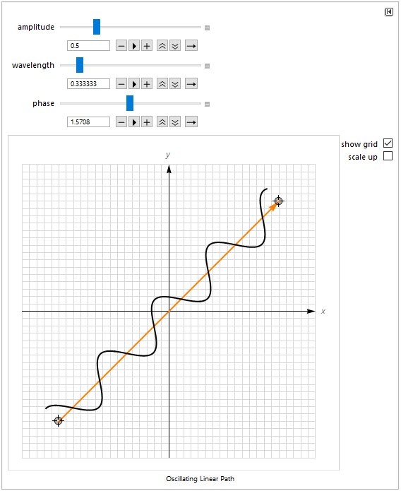 To model the planar oscillations for our fuzzy trajectories we chose to start with simple sine functions. The wave parameters that we exposed to our game designers included an amplitude (A), a wavelength (Lambda), and a phase (phi). An angular frequency can also be easily computed as (ⲱ = 1/Lambda).