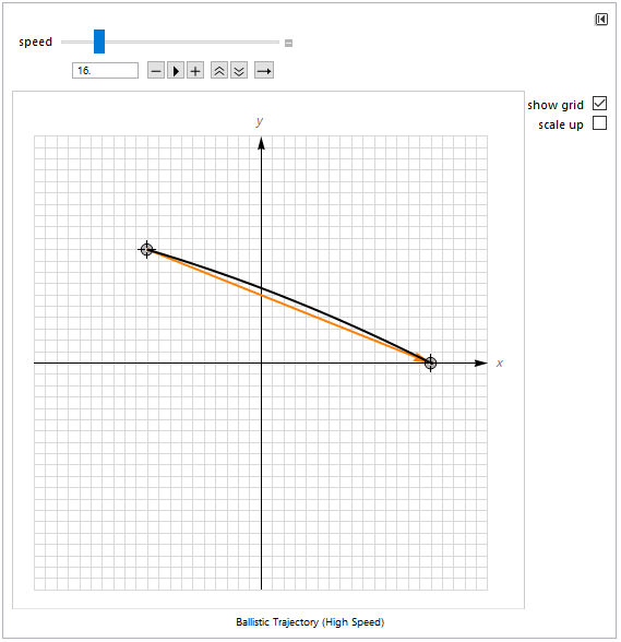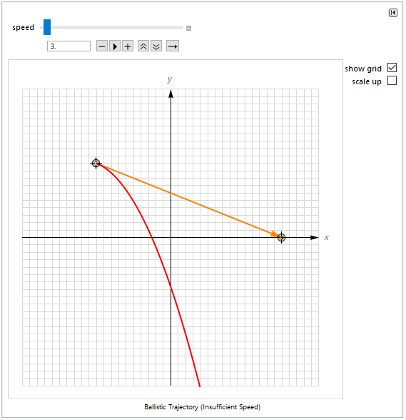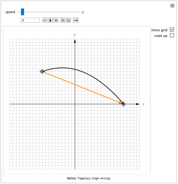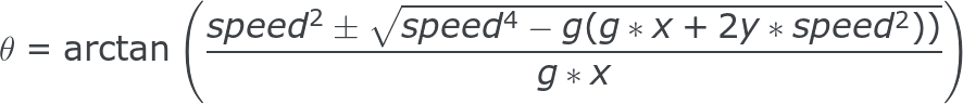 If the speed of the projectile is not high enough relative to the distance to the target, the solutions for theta are imaginary, and thus no real launch angle can result in a trajectory that hits the target. In cases like that, it may be best either to not shoot at all, or to launch the projectile at a 45° angle - guaranteeing maximum range, despite coming short of the target. On the other hand, when real valued solutions exist, you will have a choice between two possible shot angles. In most cases, it will make more sense to chose the smaller of the two solutions (using the ‘-’ sign when computing theta). This gives the more direct path. A caveat with this choice might be that the resulting path could become more straight than you want at higher launch speeds. Alternatively, you can solve for the high-arcing launch angle that gives a less direct path.