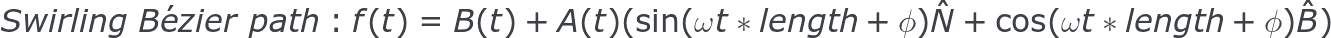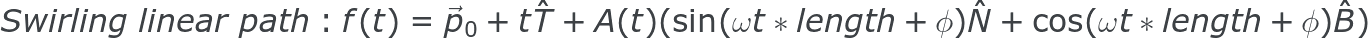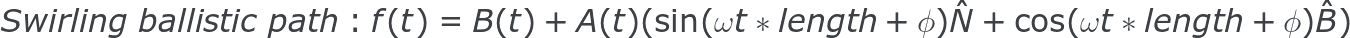 As was described in the previous section, adding oscillations to our trajectories simply meant adding modified sinusoidal displacements along a chosen normal direction, perpendicular to the line towards the target. Swirls can be implemented in an almost identical manner, but we also need to choose a binormal displacement direction in addition to the tangent and normal vectors. Since our base path is linear, it is simplest to use our known forward direction vector and our previously chosen normal vector and construct the binormal as:
